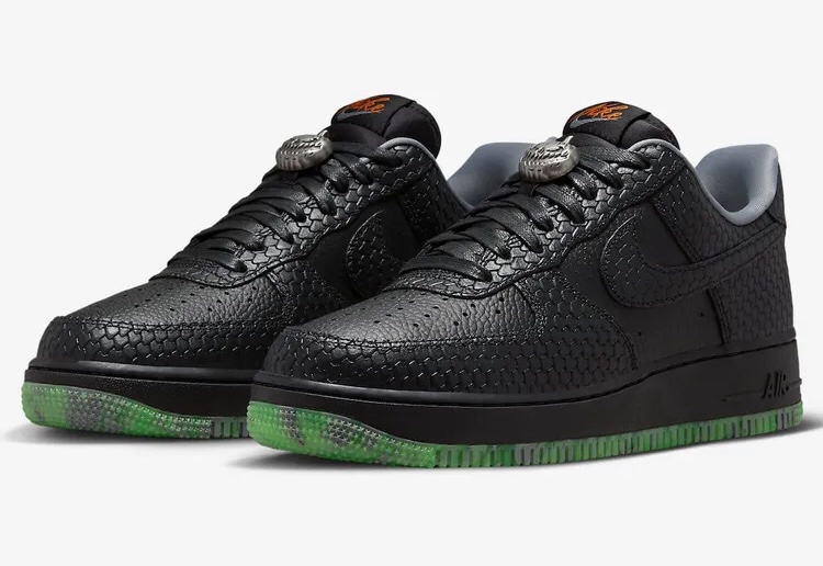 The Air Force 1 is once again expected to be a part of this year’s Halloween-themed releases from Nike via this new colorway previewed by @Swiftsole on Instagram. The sneakers feature a gray and green rubber sole and a dark, black midsole with black “AIR” branding near the heel. The upper features blacked-out tumbled and reptile leather. The laces have a silver pumpkin lace lock on top, and the tongue features orange Nike branding.