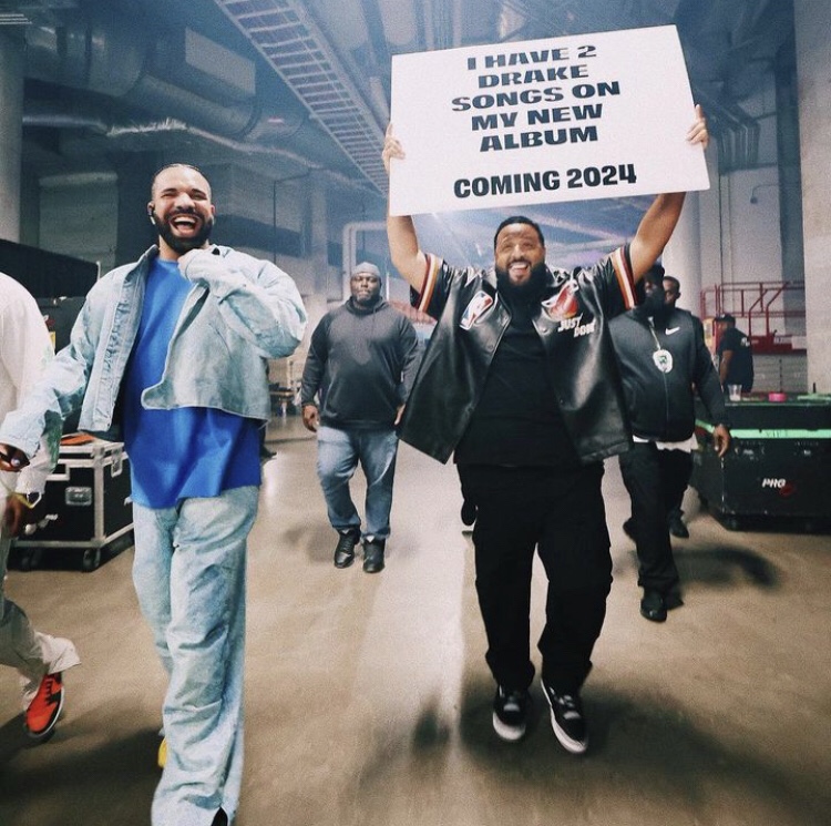 DJ Khaled decided to bring a huge sign with him that read: “I have 2 Drake songs on my new album — coming 2024.”